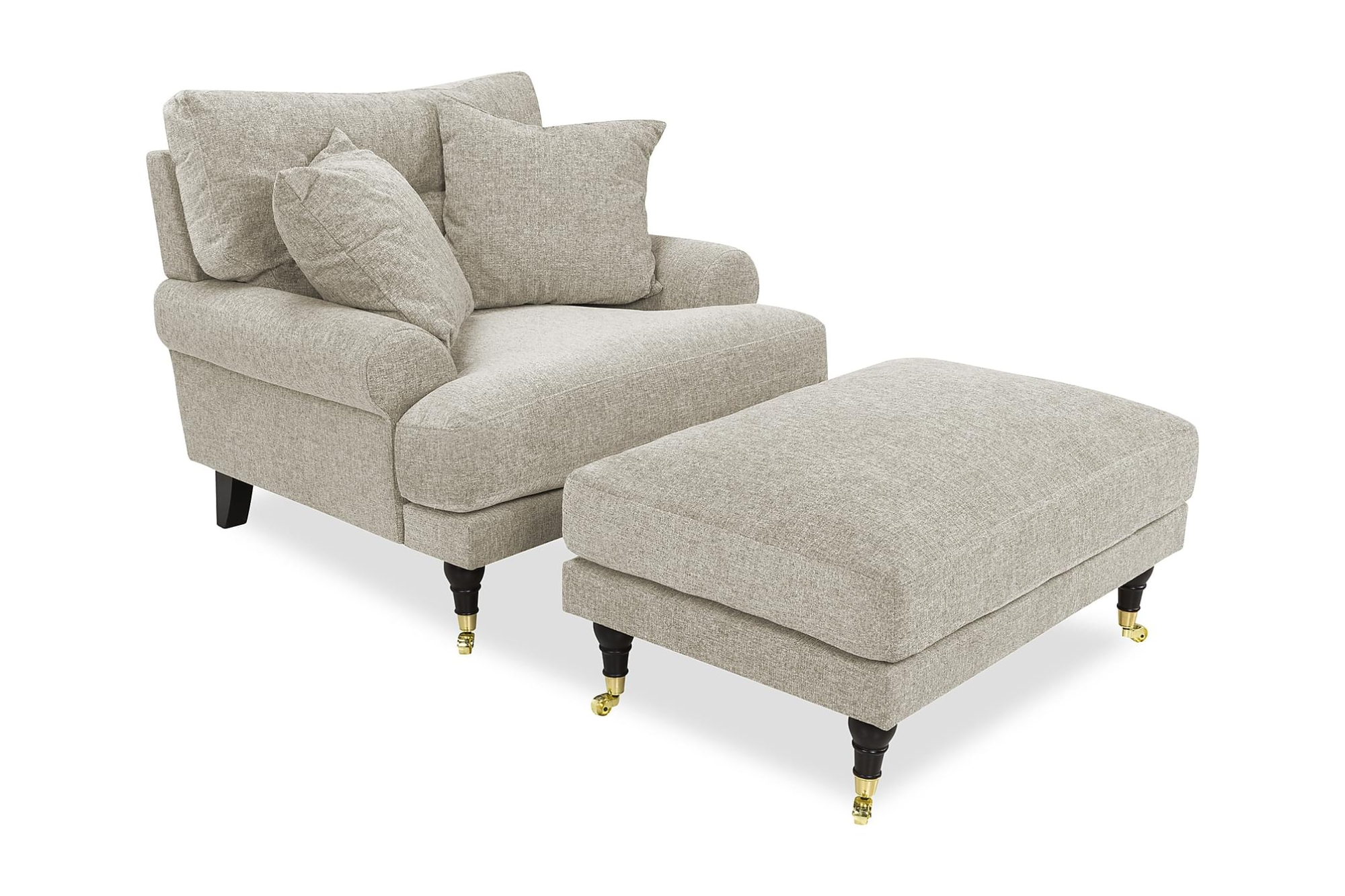 Andrew er en skøn og komfortabel lænestol i blødt stof, som vil være et smukt indslag i dit hjem. Lænestolen fås med en tilhørende puf, som fuldender udtrykket og gør siddekomforten ekstra god. Den har stilfulde og gennemførte detaljer som messinghjul og