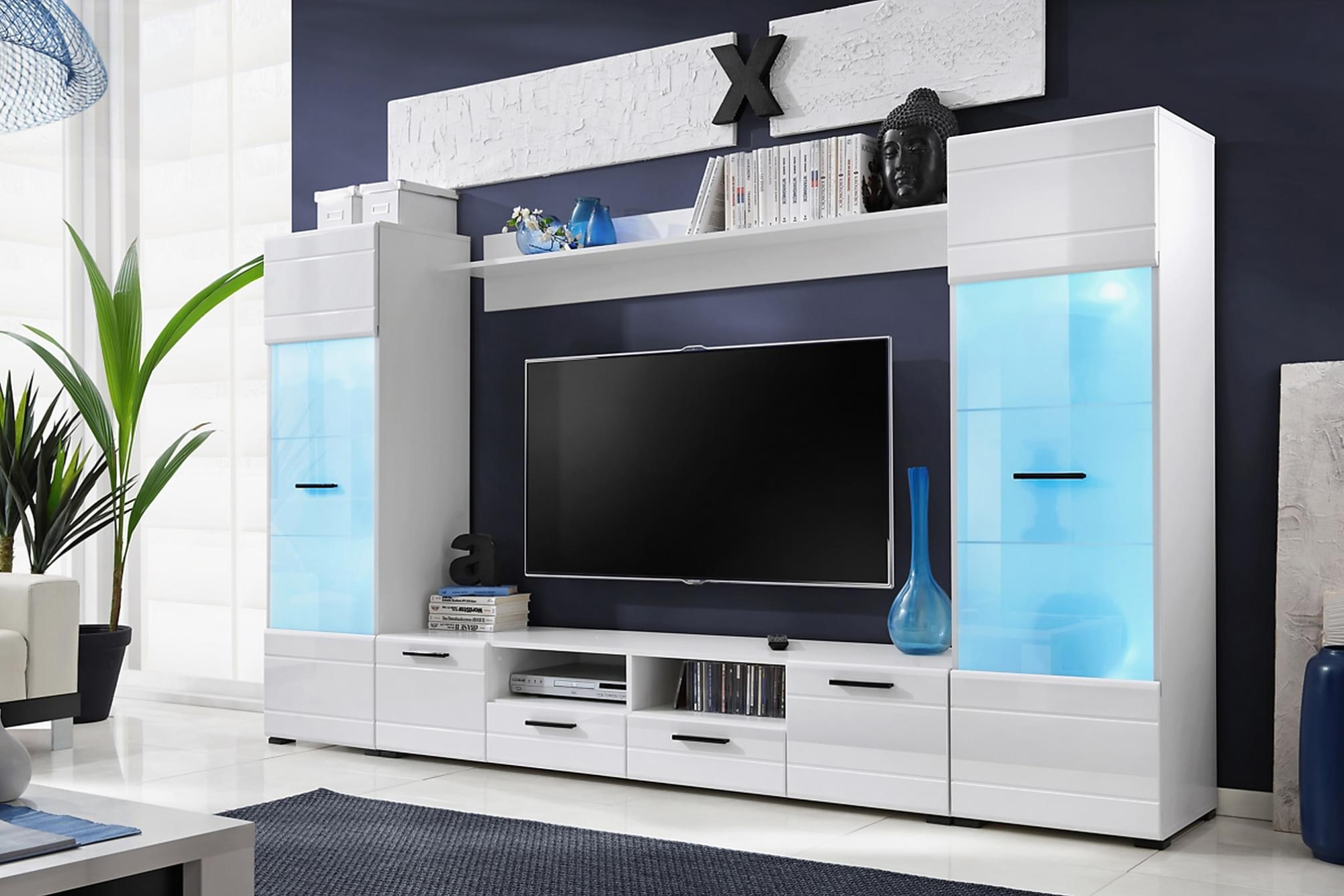 Et flot og prisfornuftig mediemøbel fra serien Apryl som er fremstillet i en futuristisk stil. Apryl er mediemøblet der giver dig både åben og gemt opbevaring i samme kombination. Udover meget opbevaringsplads er de åbne hylder desuden perfekte til at løf