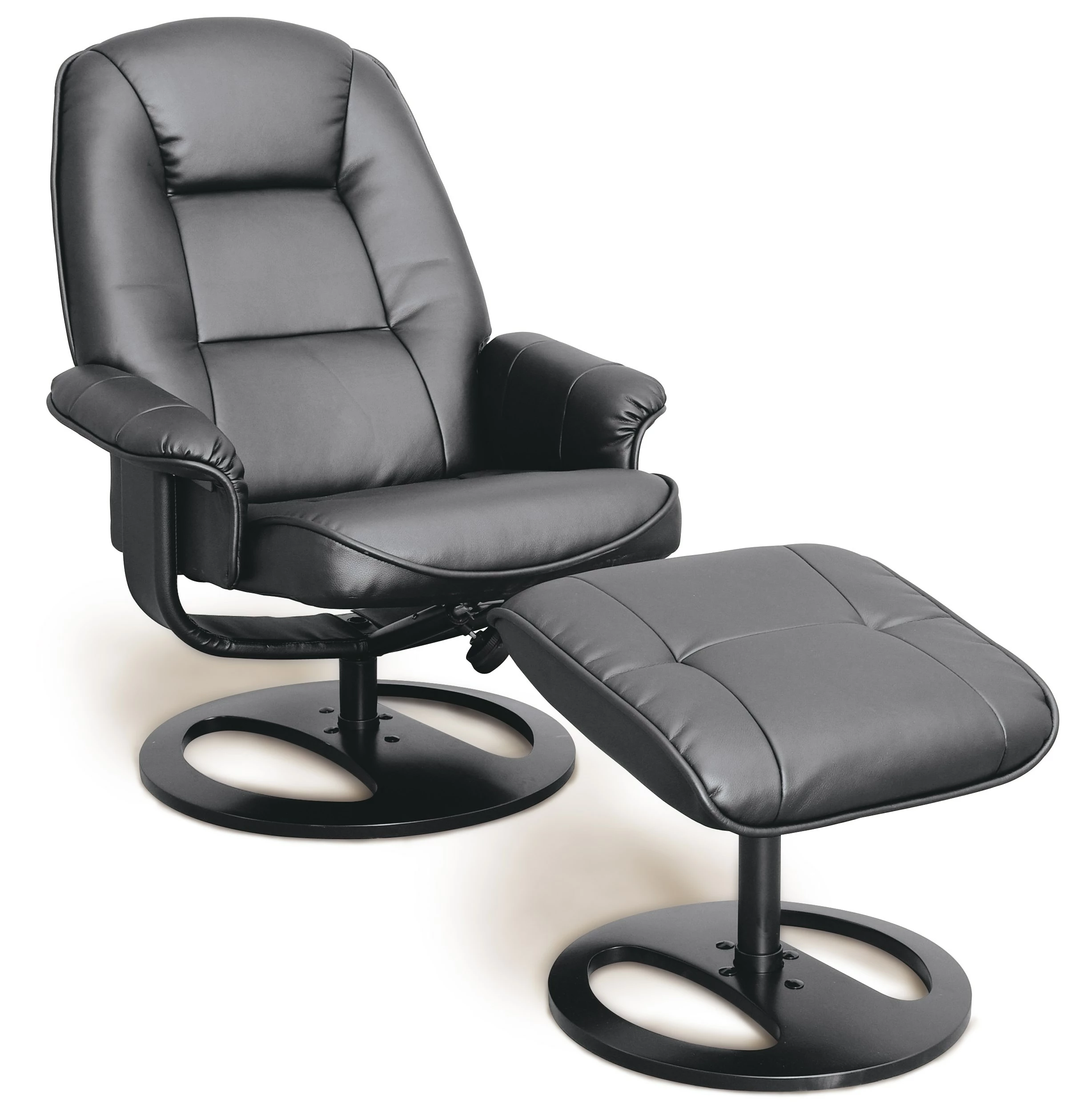 Flot klassisk lænestol inkl. fodskammel monteret med sort regenereret læder på alle slidflader. Understel på stol og skammel er i sortmalet træ. Lænestolen er med vippebeslag. Stolen måler 96 cm i højden, 75 cm i dybden og 74 cm i længden. Se alle vores l
