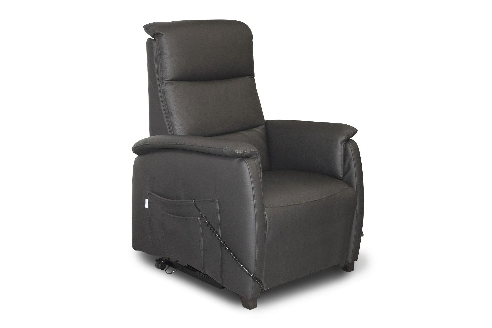 Vores Lindus lænestol i sort okselæder er med indbygget fodstøtte, regulerbar ryg og udstigningshjælp. Stolen er udstyret med elfunktion med to motorer. Der er desuden monteret en betjeningspanel i højre side. Lænestolen løfter ca. 150 kg. Se Lindus-serie