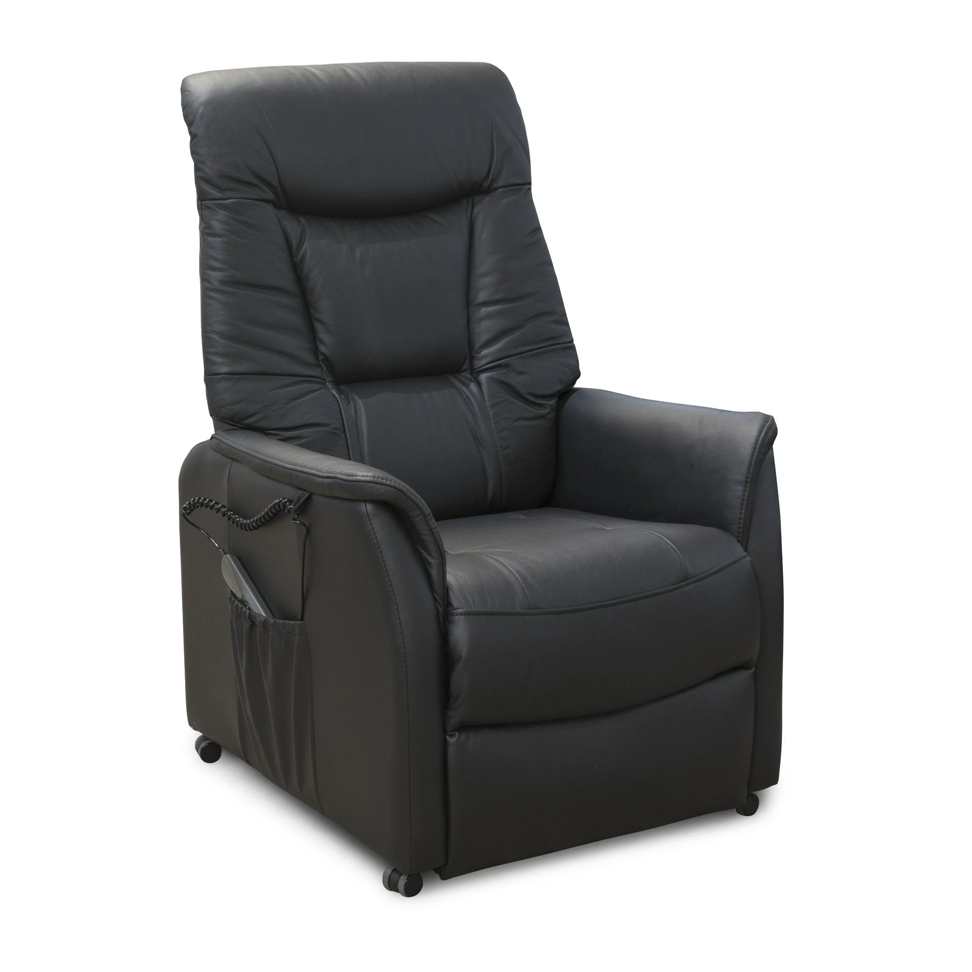 Lænestol monteret med sort stof. Der er indbygget fodstøtte, regulerbar ryg, manuel nakkeregulering og udstigningshjælp. Stolen er med elfunktion med én motor. Betjeningspanelet er monteret i højre side. Sidst, men ikke mindst, så er lænestolen monteret m