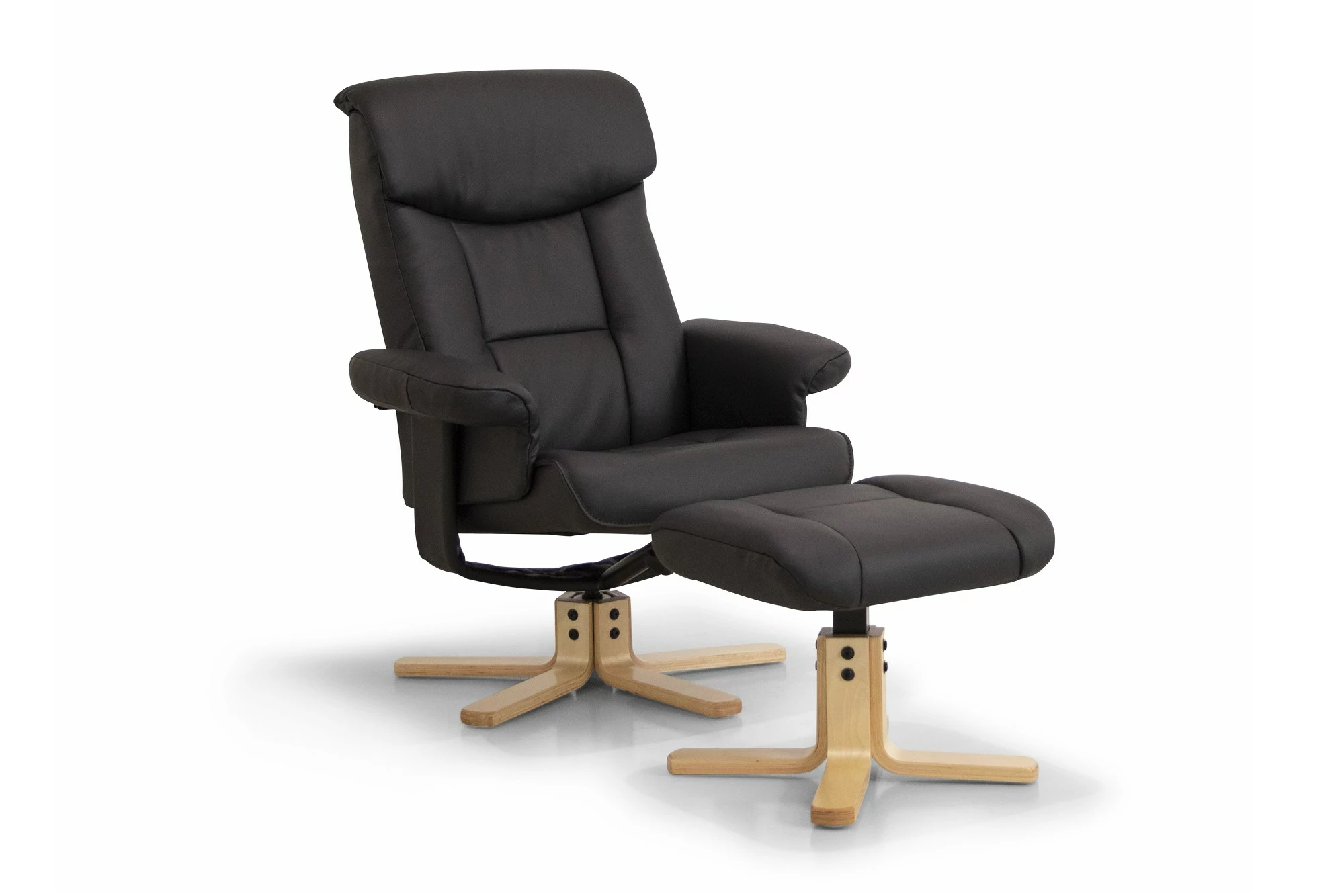 Lænestol monteret med sort bonded læder og naturfarvet stel. Stolen er med fodskammel og trinløs regulering af ryggen. Den måler 104,80 cm i højden, 102,90 cm i dybden og 79 cm i længden. Se hele Maribo-serien her. Husk at møbler skal plejes og vedligehol