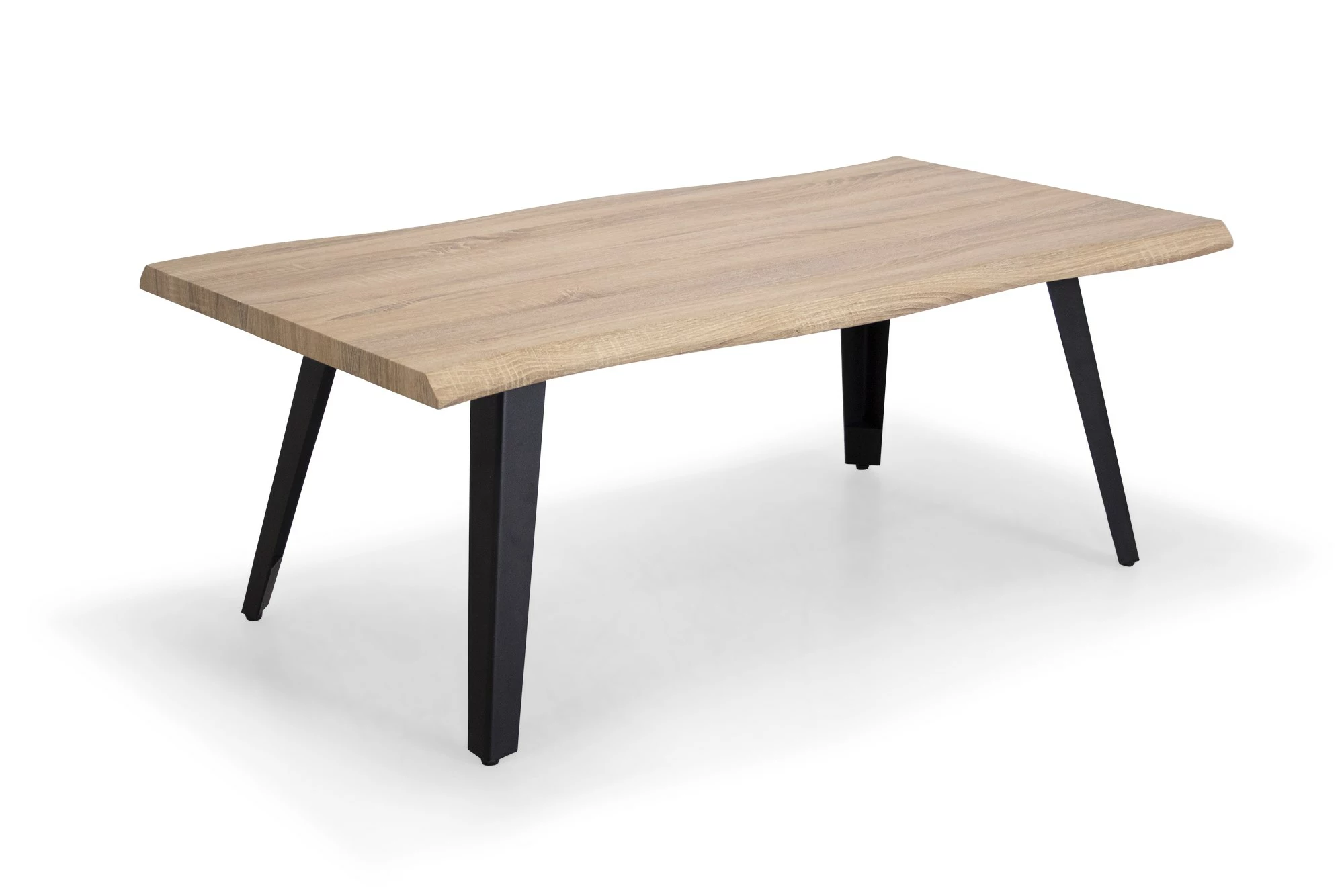 Sofabord i hvidolieret egefolie på overfladen og med sorte metalben. Bordet måler 48 cm i højden, 70 cm i dybden og 130 cm i længden. Folie er et fleksibelt materiale, som muliggør at beklæde flotte organiske faconer. Folie er et mindre stærkt materiale e