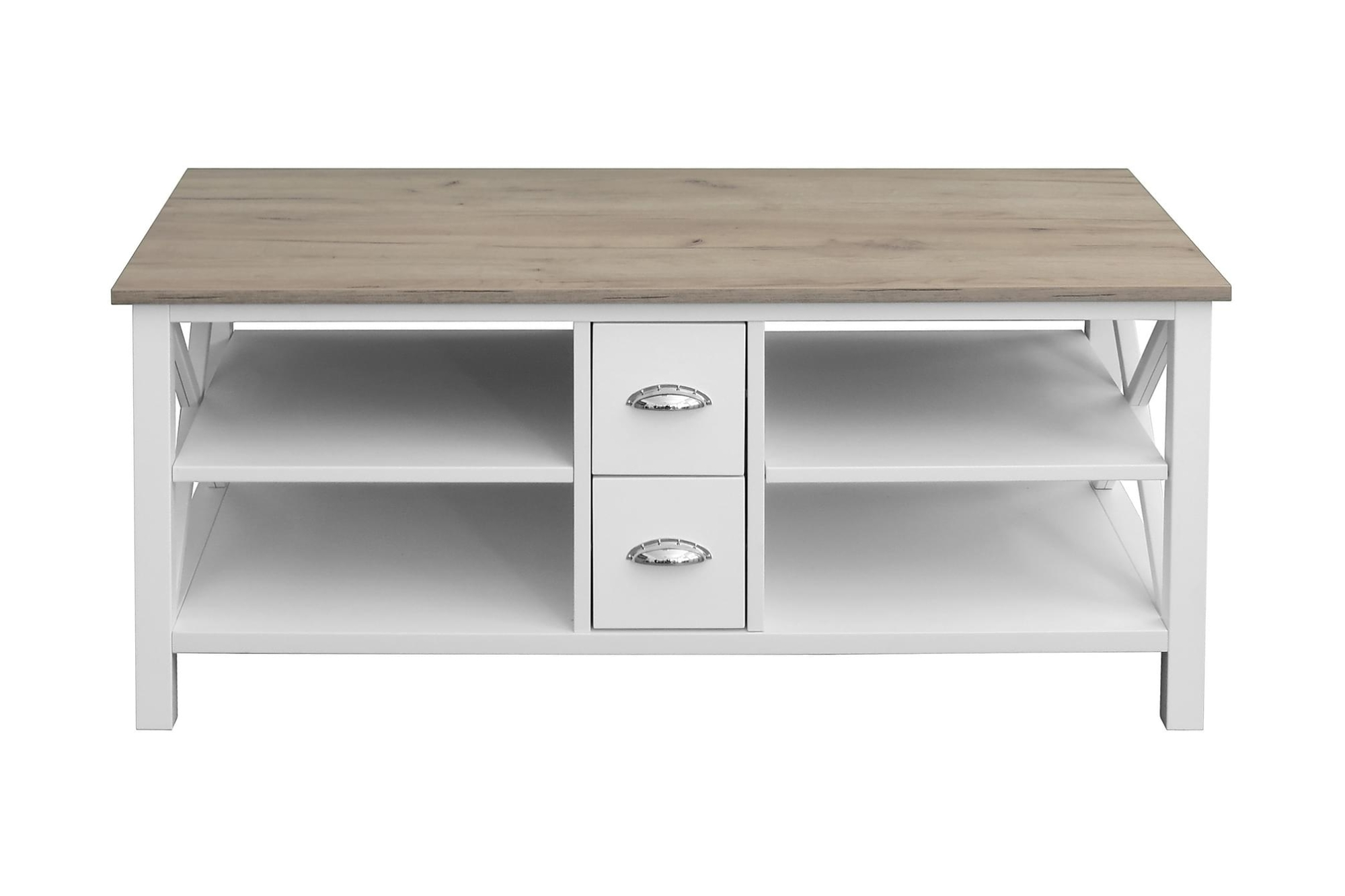 Mikael sofabord med skuffer har et klassisk design med et moderne præg. Bordet har praktiske hylder og en lysegrå bordplade i beton-mønstret laminat. Smukke detaljer, bl.a forkromede beslag og dekorative kryds i enderne, fuldender helhedsindtrykket af det