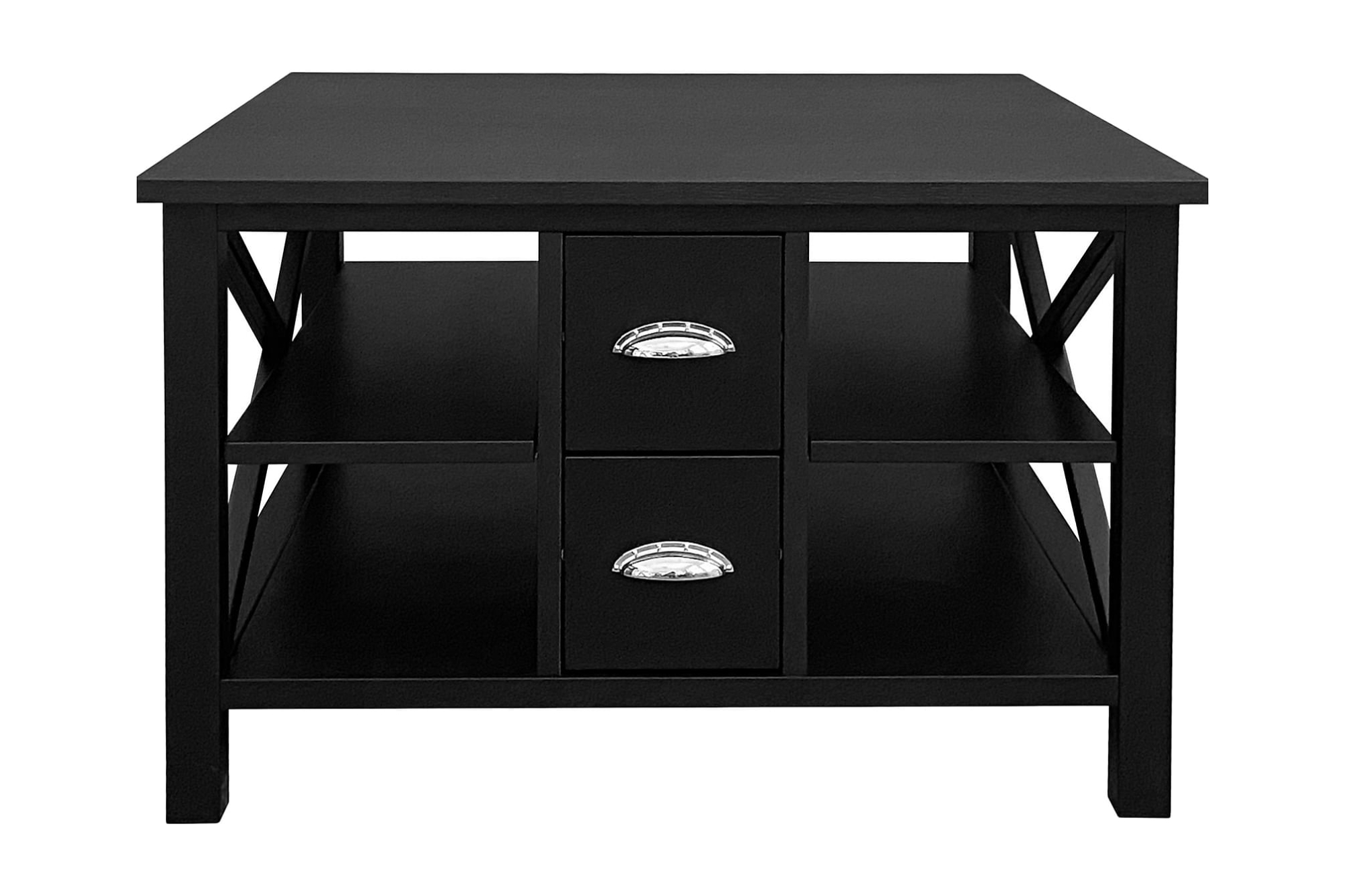 Mikael sofabord med skuffer har et klassisk design med et moderne præg. Bordet har praktiske hylder og en lysegrå bordplade i beton-mønstret laminat. Smukke detaljer, bl.a forkromede beslag og dekorative kryds i enderne, fuldender helhedsindtrykket af det